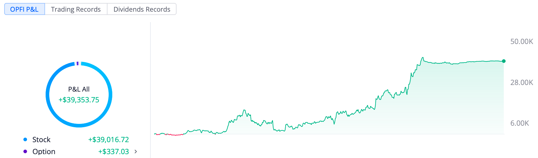 So far OPFI is holding 3rd place for my largest win in $$$ (SFM 1st, and SPOT 2nd)