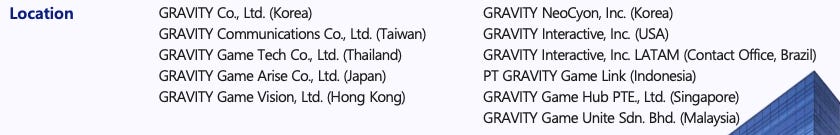 Geographic reach: Historically, Gravity’s money was made in Asia, in particular Korea (its home), Taiwan, Thailand, and other Southeast Asian countries where Ragnarok is a nostalgic brand name. Americas accounts for about a fifth of their revenue.