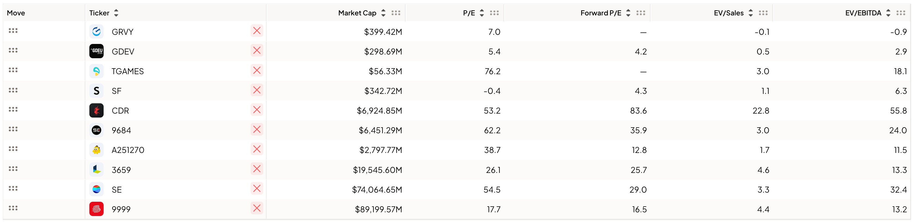 GDEV (Cyprus-based publisher best known for Hero Wars): Trades around 9–10x P/E, ~0.7–0.8x sales, and mid‑4x EV/EBITDA. The market gives it a premium to Gravity on earnings for its flagship live‑ops franchise, but still values it as a neglected gaming asset. In practice, it sits much closer to Gravity’s “deep value” bucket than to high‑multiple large‑cap peers