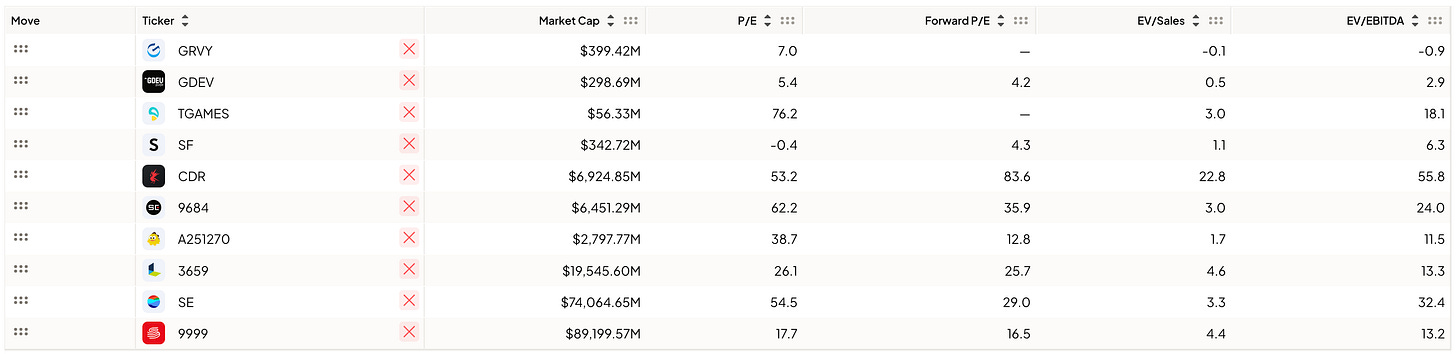 CD Projekt (Polish studio behind The Witcher and Cyberpunk 2077): Trades around 50x P/E and 22x sales despite a rocky 2020-2021. Investors give it a rich multiple in hopes of future blockbuster releases. Basically the opposite of Gravity’s situation.