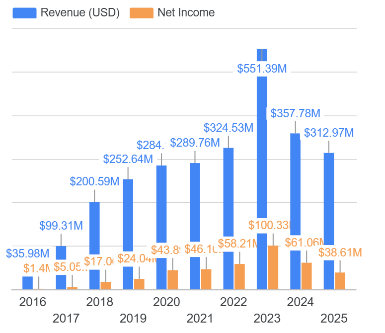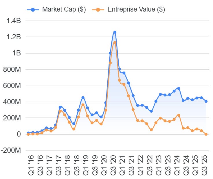 Yet despite its strong earnings — 29% CAGR from 2016 to 2024 whilst growing net profits from $1 to $58 millions in the same time — Gravity’s stock has been persistently poorly priced. At around $57 per share, the ADR trades at a trailing P/E of ~7. EV/Sales is not even worth mentioning, since it’s now negative! In other words, the market is assigning zero value to Gravity’s business beyond its cash holdings.
