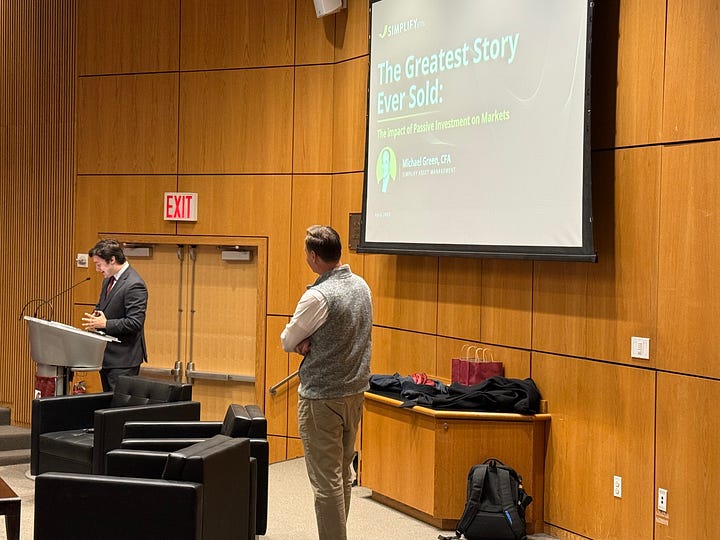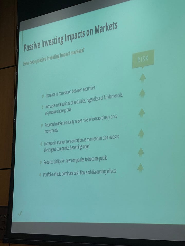 Mr Green gave a talk on how passive investing “kind of (lightly said)” ruining the investing world, because of passive investing markets are more irrational then ever and in the bubble zone, the problem there is really no real solution (per se).